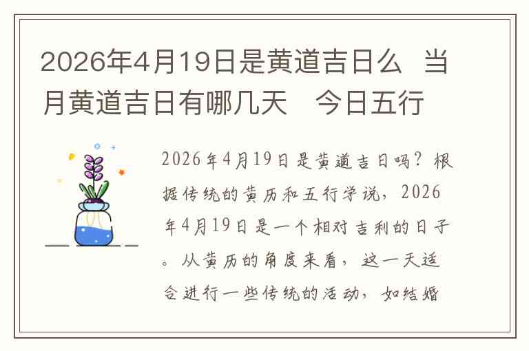 总的来说,2026年4月19日是黄道吉日,并且4月内的其他几天也有一些适宜的吉日。而今天的五行穿衣指南建议选择金色或白色,以帮助提升个人气场。