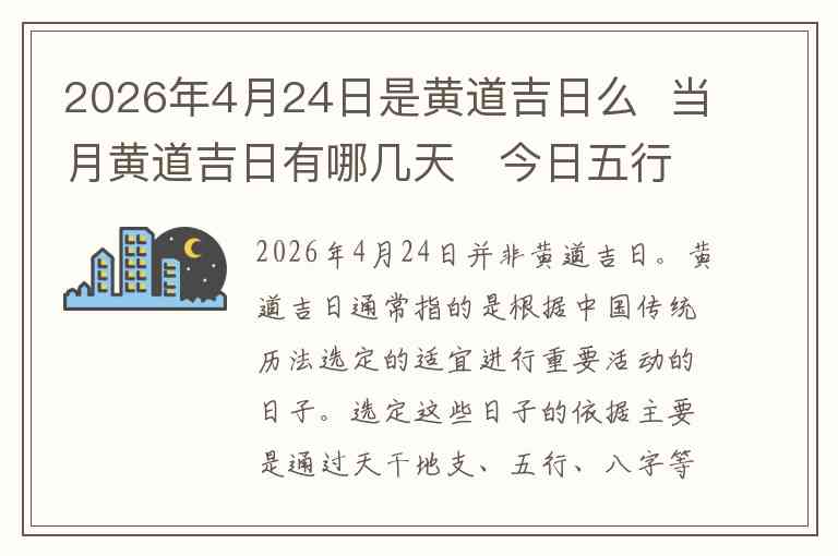 2026年4月24日并非黄道吉日。黄道吉日通常指的是根据中国传统历法选定的适宜进行重要活动的日子。选定这些日子的依据主要是通过天干地支、五行、八字等因素来推算的,不是每一天都适宜进行所有重要事务。而2026年4月24日这一天,根据天干地支和五行的推算,属于普通日子,不是特别适合举行婚庆、开业、搬家等大事。