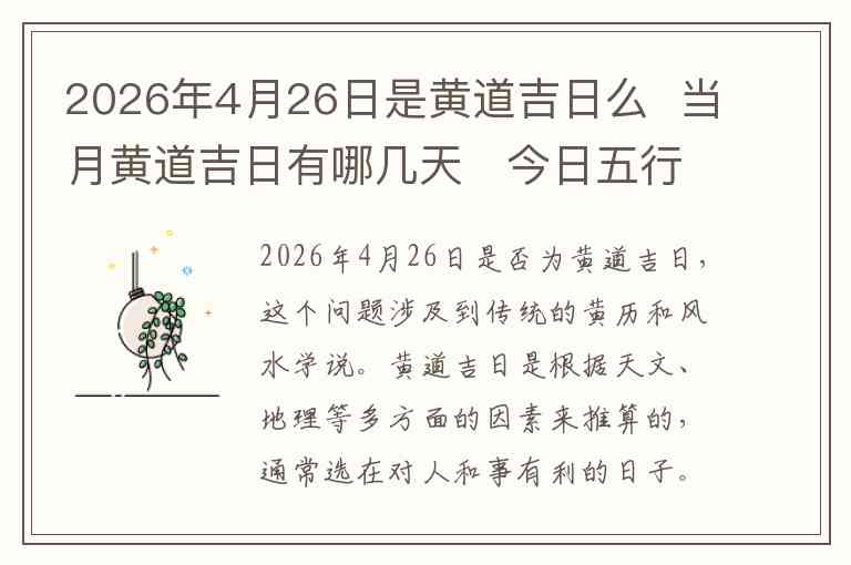2026年4月26日是否为黄道吉日,这个问题涉及到传统的黄历和风水学说。黄道吉日是根据天文、地理等多方面的因素来推算的,通常选在对人和事有利的日子。根据2026年4月的黄历,4月26日确实是一个黄道吉日,适合举行一些重要的活动,如婚礼、开业、安床、搬家等。黄道吉日的推算不仅与天干地支、五行相结合,还和每个日子的"冲煞"等因素有关,因此这个日子被认为是一个适合办喜事和进行重要决定的良辰吉日。
