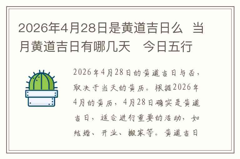 2026年4月28日的黄道吉日与否,取决于当天的黄历。根据2026年4月的黄历,4月28日确实是黄道吉日,适合进行重要的活动,如结婚、开业、搬家等。黄道吉日是指符合天时地利,五行、方位等多重因素相合,适合举办各种吉庆活动的日子。