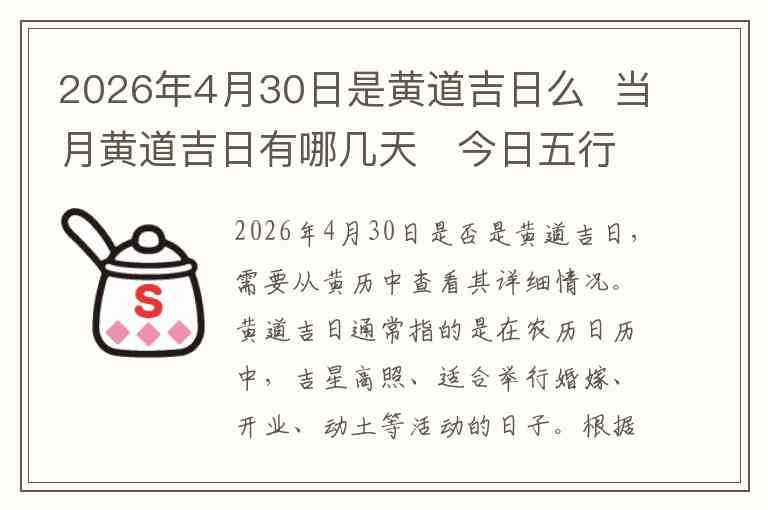 2026年4月30日是否是黄道吉日,需要从黄历中查看其详细情况。黄道吉日通常指的是在农历日历中,吉星高照、适合举行婚嫁、开业、动土等活动的日子。根据2026年4月的黄历,4月30日的农历日期是乙巳日,通常这一天适合举行一些吉利的活动,尤其是在婚姻、开业、祈福等方面,乙巳日是比较适宜的日子,所以可以认为是黄道吉日。