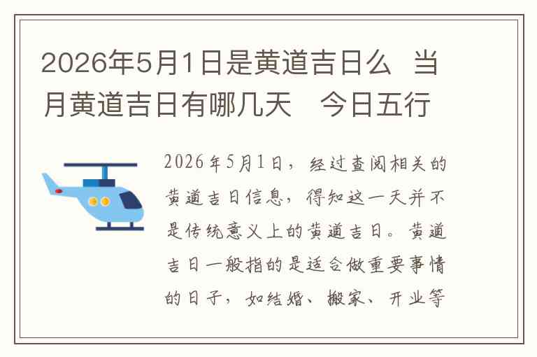 2026年5月1日,经过查阅相关的黄道吉日信息,得知这一天并不是传统意义上的黄道吉日。黄道吉日一般指的是适合做重要事情的日子,如结婚、搬家、开业等,通常依据传统的五行八字和天文历法推算得出。对于2026年5月的黄道吉日,我们可以找到如下几个适宜做事的日子: