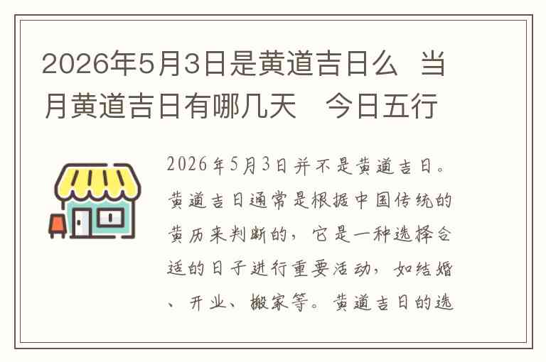 2026年5月3日并不是黄道吉日。黄道吉日通常是根据中国传统的黄历来判断的,它是一种选择合适的日子进行重要活动,如结婚、开业、搬家等。黄道吉日的选择基于天干地支、五行、星宿等因素。根据黄历推算,2026年5月3日的日期与黄道吉日的标准并不匹配,因此它不是一个适合进行重要活动的吉日。