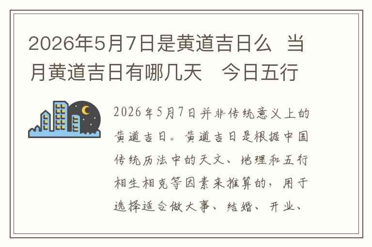 2026年5月7日并非传统意义上的黄道吉日。黄道吉日是根据中国传统历法中的天文、地理和五行相生相克等因素来推算的,用于选择适合做大事、结婚、开业、搬家等吉利的日子。根据2026年的黄历推算,5月7日并没有显示为黄道吉日。