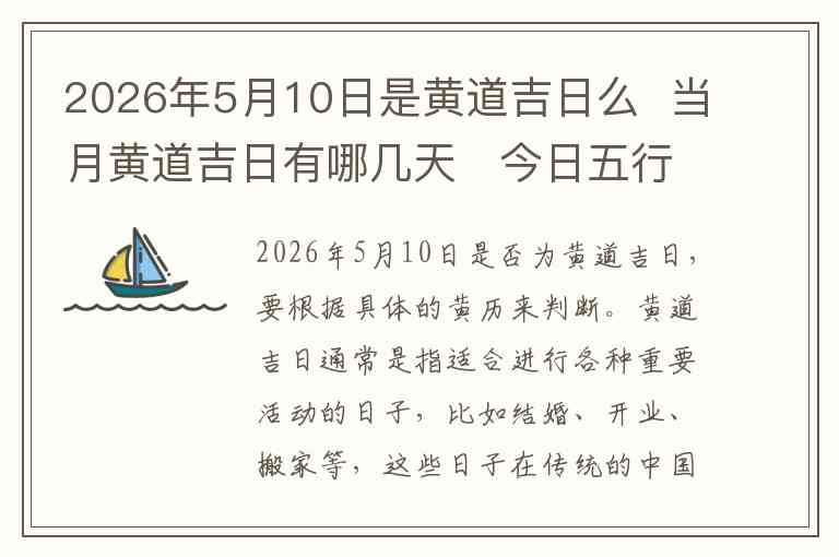 2026年5月10日是否为黄道吉日,要根据具体的黄历来判断。黄道吉日通常是指适合进行各种重要活动的日子,比如结婚、开业、搬家等,这些日子在传统的中国农历中有着特别的象征意义。黄道吉日的选择依据了天干地支、五行相生相克、以及日柱和时辰等多方面的因素。因此,确定某一天是否为黄道吉日,需要查阅相关的黄历。