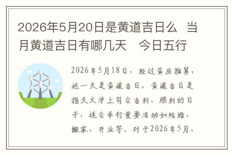 对于2026年5月20日,这一天是黄道吉日。黄道吉日的特性是其有利于举行婚庆、搬迁等传统习惯认为需要吉祥日的活动。在本月,除了5月20日外,黄道吉日还包括5月22日、5月24日等几天。