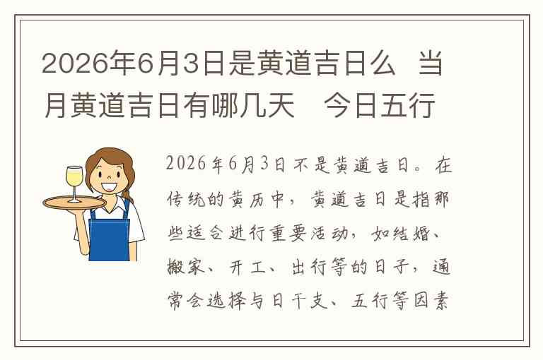 2026年6月3日不是黄道吉日。在传统的黄历中,黄道吉日是指那些适合进行重要活动,如结婚、搬家、开工、出行等的日子,通常会选择与日干支、五行等因素相合的日期来作为吉日。根据2026年6月的黄历,6月3日并不被列为黄道吉日,通常选择与所要进行的活动相合的日子才是最佳选择。