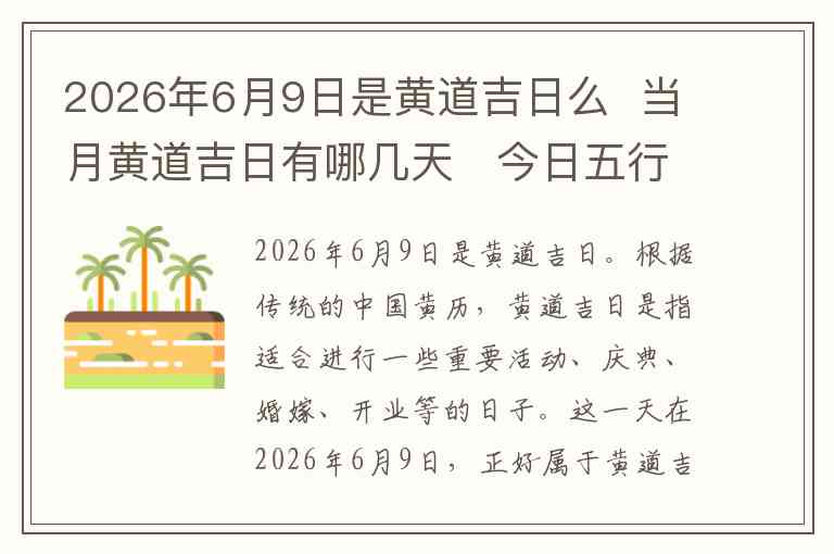 2026年6月9日是黄道吉日。根据传统的中国黄历,黄道吉日是指适合进行一些重要活动、庆典、婚嫁、开业等的日子。这一天在2026年6月9日,正好属于黄道吉日,适合进行一些大事。