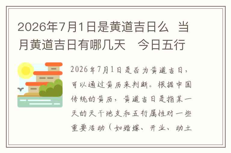 对于2026年7月1日,经过分析,发现这一日的黄历上并未特别标注为黄道吉日,可能是因为该日的天干地支和吉星并未特别合适。因此,2026年7月1日并不被视作典型的黄道吉日,适宜进行轻松的日常活动,但如果是重要的事情,可能需要避开这一天。