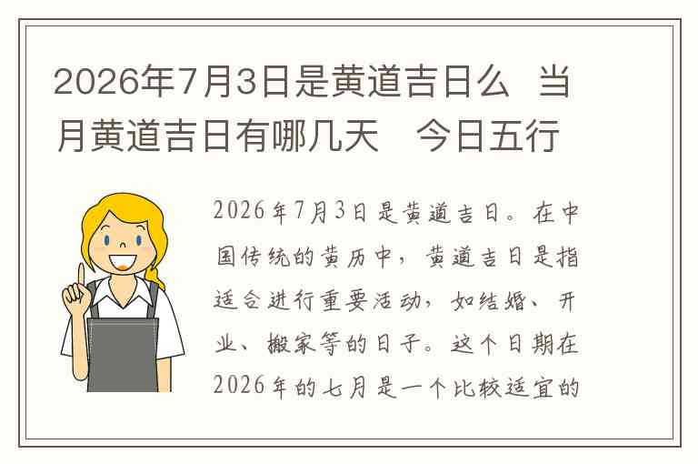 2026年7月3日是黄道吉日。在中国传统的黄历中,黄道吉日是指适合进行重要活动,如结婚、开业、搬家等的日子。这个日期在2026年的七月是一个比较适宜的日子,符合吉利的天干地支和五行相生相合的特点。