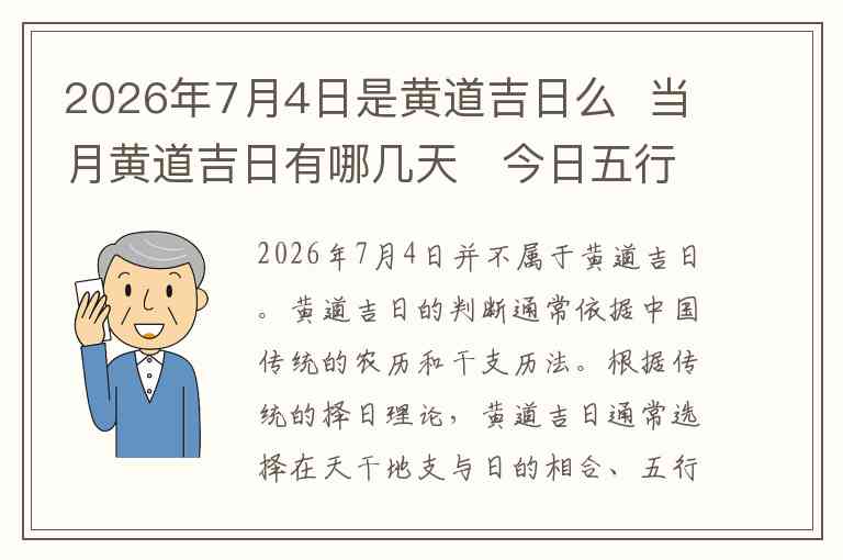 2026年7月4日并不属于黄道吉日。黄道吉日的判断通常依据中国传统的农历和干支历法。根据传统的择日理论,黄道吉日通常选择在天干地支与日的相合、五行相生的日子,特别是选择对人的命理有利的时日。