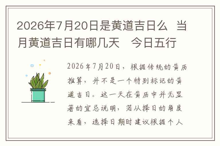 2026年7月20日,根据传统的黄历推算,并不是一个特别标记的黄道吉日。这一天在黄历中并无显著的宜忌说明,若从择日的角度来看,选择日期时建议根据个人的生辰八字来考虑是否合适。