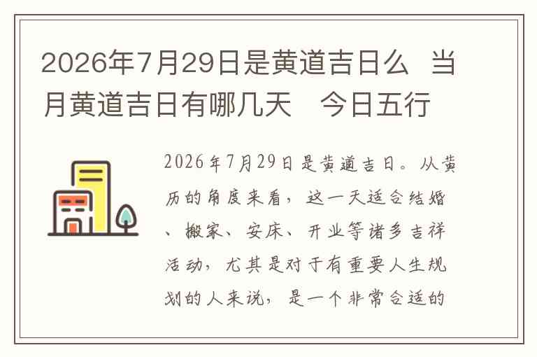 2026年7月29日是黄道吉日。从黄历的角度来看,这一天适合结婚、搬家、安床、开业等诸多吉祥活动,尤其是对于有重要人生规划的人来说,是一个非常合适的选择。