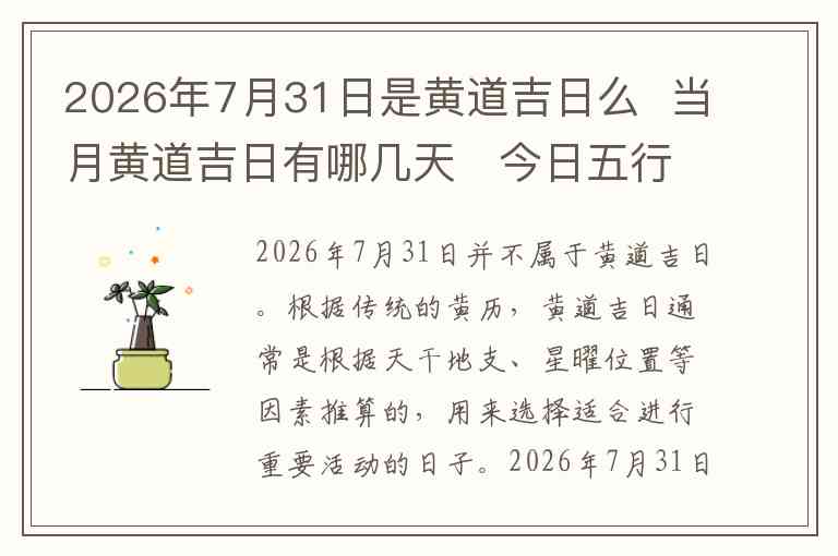 2026年7月31日并不属于黄道吉日。根据传统的黄历,黄道吉日通常是根据天干地支、星曜位置等因素推算的,用来选择适合进行重要活动的日子。2026年7月31日属于阴历六月二十六日,这一天的综合情况在传统的黄历中并未标注为黄道吉日,因此不建议作为结婚、动土、开业等大事的选择日。