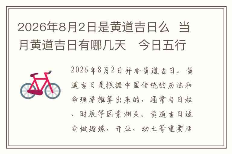 2026年8月2日并非黄道吉日。黄道吉日是根据中国传统的历法和命理学推算出来的,通常与日柱、时辰等因素相关。黄道吉日适合做婚嫁、开业、动土等重要活动,因此在选择吉日时,人们会特别关注这些日子的天干地支和五行的匹配。