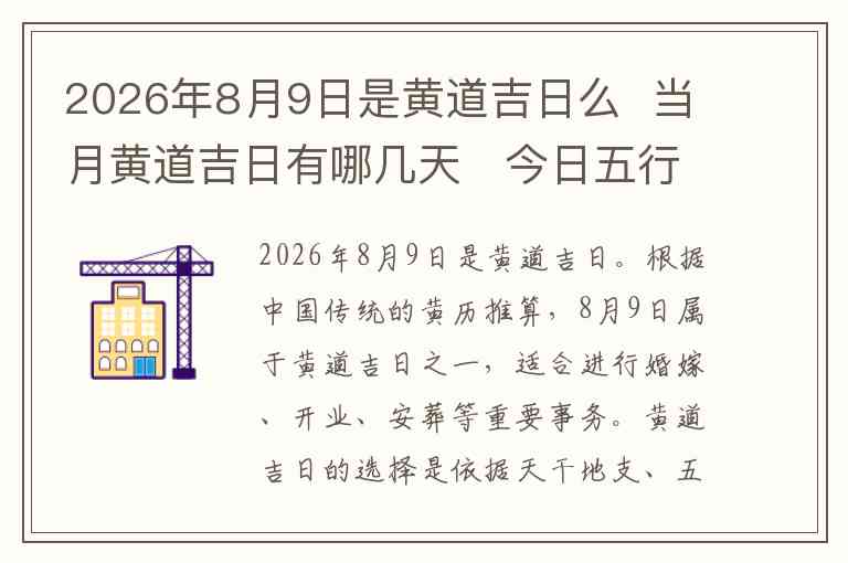 2026年8月9日是黄道吉日。根据中国传统的黄历推算,8月9日属于黄道吉日之一,适合进行婚嫁、开业、安葬等重要事务。黄道吉日的选择是依据天干地支、五行、八字等多方面的因素,按照传统习惯,这一天有较好的气场和运势。