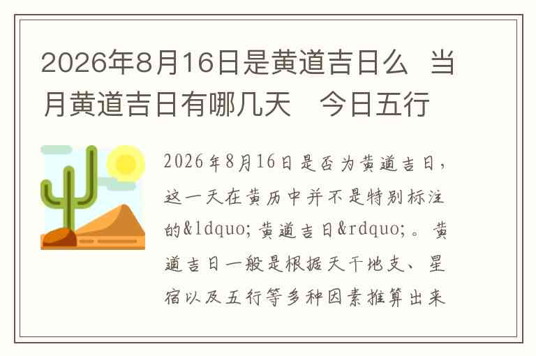 2026年8月16日是否为黄道吉日,这一天在黄历中并不是特别标注的“黄道吉日”。黄道吉日一般是根据天干地支、星宿以及五行等多种因素推算出来的,它们通常是择日和吉凶时辰的重要参考,尤其适用于婚嫁、开业、搬家等重大事务。从黄历的角度来看,8月16日这一天并没有显现出特别的吉祥象征。