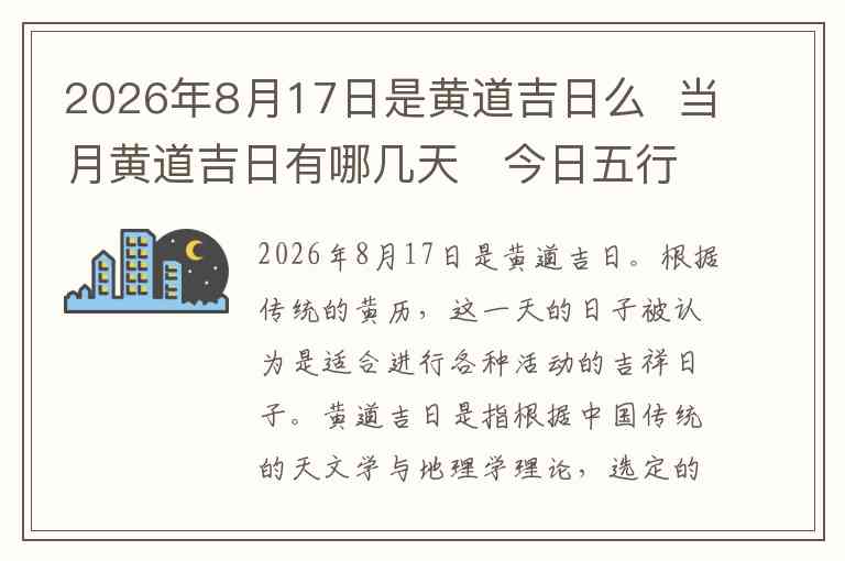 2026年8月17日是黄道吉日。根据传统的黄历,这一天的日子被认为是适合进行各种活动的吉祥日子。黄道吉日是指根据中国传统的天文学与地理学理论,选定的有利于开展一些重要事务的日子。黄道吉日通常与黄历的“日德”相结合,是选婚嫁、开业、安床、动土等活动的好时机。