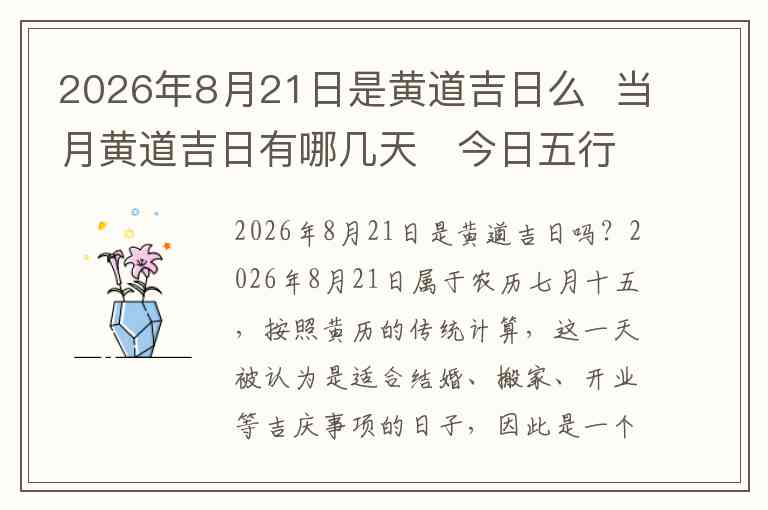 2026年8月21日属于农历七月十五,按照黄历的传统计算,这一天被认为是适合结婚、搬家、开业等吉庆事项的日子,因此是一个黄道吉日。黄道吉日通常是根据天干地支的组合以及相关的五行和日历来判断的,而这一天在中国的传统黄历中被标定为适合许多重要活动的日子。