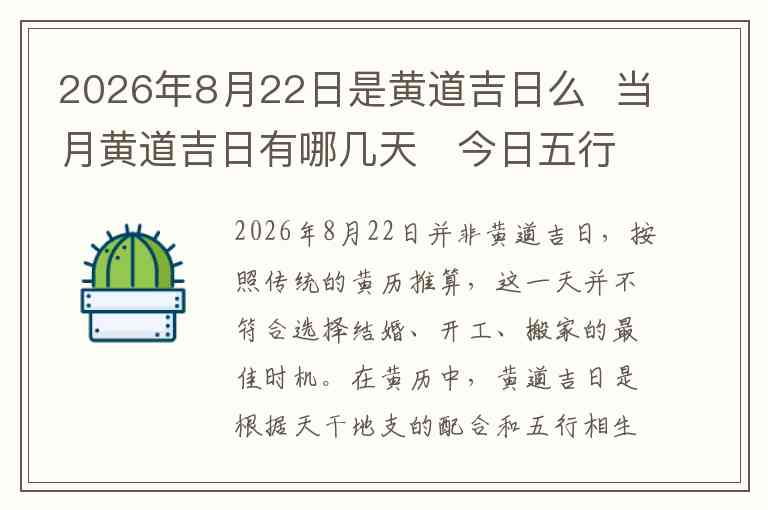 2026年8月22日并非黄道吉日,按照传统的黄历推算,这一天并不符合选择结婚、开工、搬家的最佳时机。在黄历中,黄道吉日是根据天干地支的配合和五行相生相克的规律来推算的,通常是那些带有“黄道”字样的日子,是指适宜进行重要活动的日期。而8月22日这一天的天干地支组合并不符合传统意义上的黄道吉日。