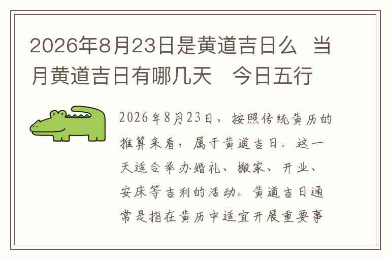 2026年8月23日,按照传统黄历的推算来看,属于黄道吉日。这一天适合举办婚礼、搬家、开业、安床等吉利的活动。黄道吉日通常是指在黄历中适宜开展重要事务的日子,通常是根据天干地支、五行、八字等因素来确定的。黄道吉日通常会与冲煞、破日等不利日子相对应,选择吉日进行活动能带来更好的运势和顺利的结果。