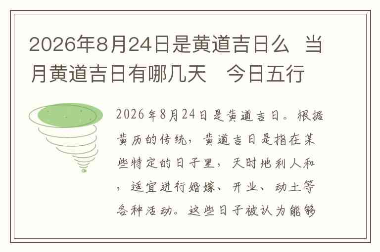 2026年8月24日是黄道吉日。根据黄历的传统,黄道吉日是指在某些特定的日子里,天时地利人和,适宜进行婚嫁、开业、动土等各种活动。这些日子被认为能够带来好运,避免灾祸。在2026年8月,黄道吉日有几天,适宜进行各种吉祥的活动。