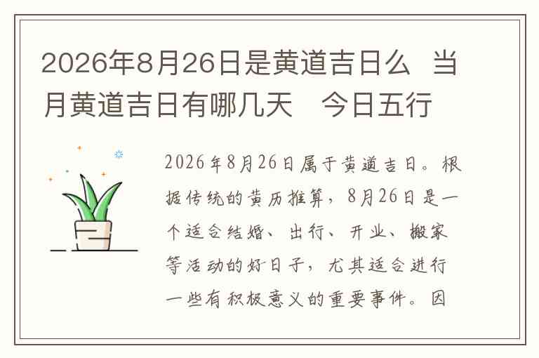 2026年8月26日属于黄道吉日。根据传统的黄历推算,8月26日是一个适合结婚、出行、开业、搬家等活动的好日子,尤其适合进行一些有积极意义的重要事件。因此,这一天可以被认为是一个吉利的日子,适合做一些大事。