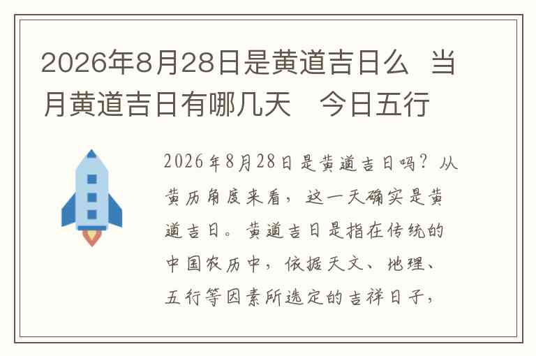 2026年8月28日是黄道吉日吗?从黄历角度来看,这一天确实是黄道吉日。黄道吉日是指在传统的中国农历中,依据天文、地理、五行等因素所选定的吉祥日子,适合举行结婚、开业、搬家、安床、开工等一系列重要活动。而对于2026年8月28日来说,正好符合这一标准,因此是一个适宜举办重要事务的好日子。