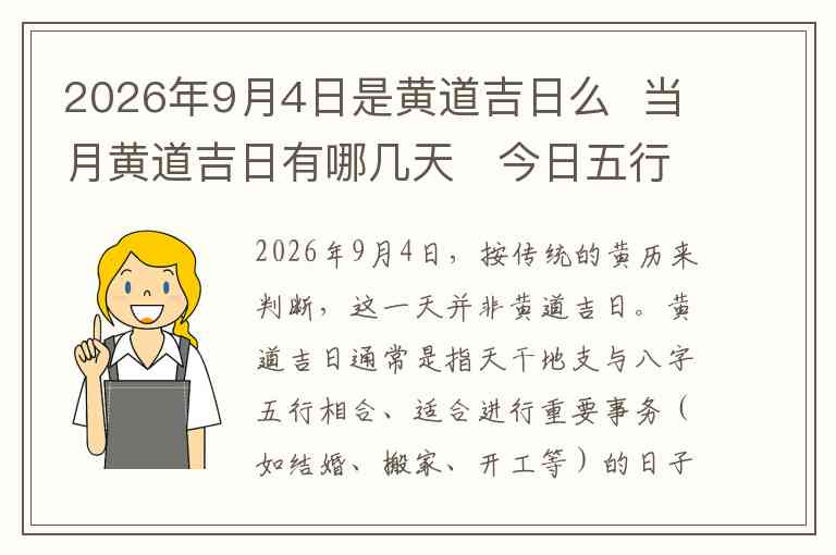 2026年9月4日,按传统的黄历来判断,这一天并非黄道吉日。黄道吉日通常是指天干地支与八字五行相合、适合进行重要事务(如结婚、搬家、开工等)的日子。这些日子一般会根据黄历中天干地支与五行的配合情况来确定。