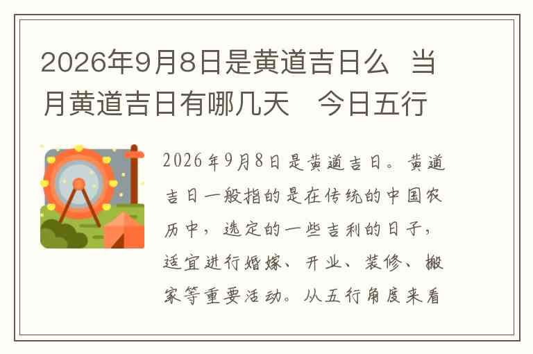 2026年9月8日是黄道吉日。黄道吉日一般指的是在传统的中国农历中,选定的一些吉利的日子,适宜进行婚嫁、开业、装修、搬家等重要活动。从五行角度来看,9月8日属于阳历9月的第八天,在农历上为辛酉日,五行属金,因此这一天是金日,适合进行与金相关的活动,如交易、投资等。