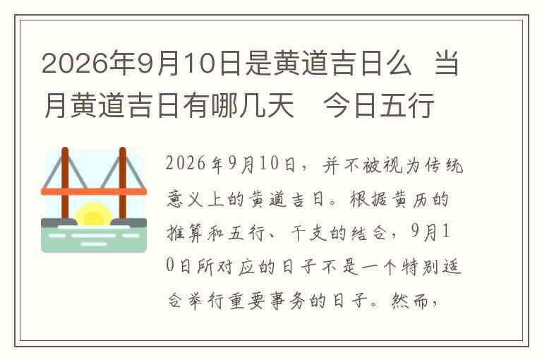 2026年9月10日,并不被视为传统意义上的黄道吉日。根据黄历的推算和五行、干支的结合,9月10日所对应的日子不是一个特别适合举行重要事务的日子。然而,黄道吉日的选择是根据不同的需求而定的,有时个人的命理、星座等因素也会影响是否适合某些活动。