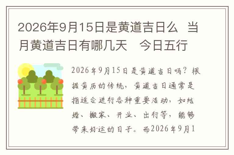 根据黄历的传统,黄道吉日通常是指适合进行各种重要活动,如结婚、搬家、开业、出行等,能够带来好运的日子。而2026年9月15日,经过黄历推算,这一天确实是黄道吉日,适合进行很多有意义的事情,特别是那些需要吉祥的日子。