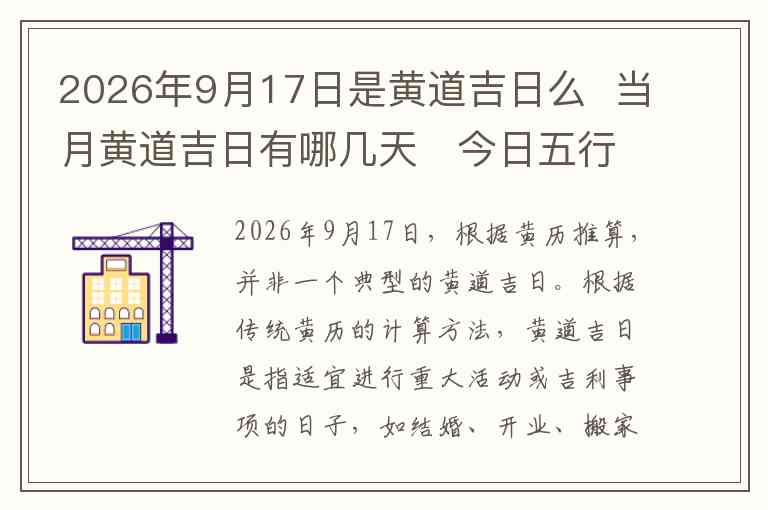 2026年9月17日,根据黄历推算,并非一个典型的黄道吉日。根据传统黄历的计算方法,黄道吉日是指适宜进行重大活动或吉利事项的日子,如结婚、开业、搬家等,而2026年9月17日并未被列为吉日。