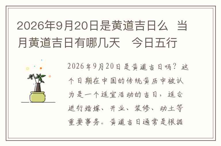 2026年9月20日是黄道吉日吗?这个日期在中国的传统黄历中被认为是一个适宜活动的吉日,适合进行婚嫁、开业、装修、动土等重要事务。黄道吉日通常是根据天干地支、五行相生相克、阴阳调和等因素来选择的,适宜从事各种开始新事业或者改变的活动。