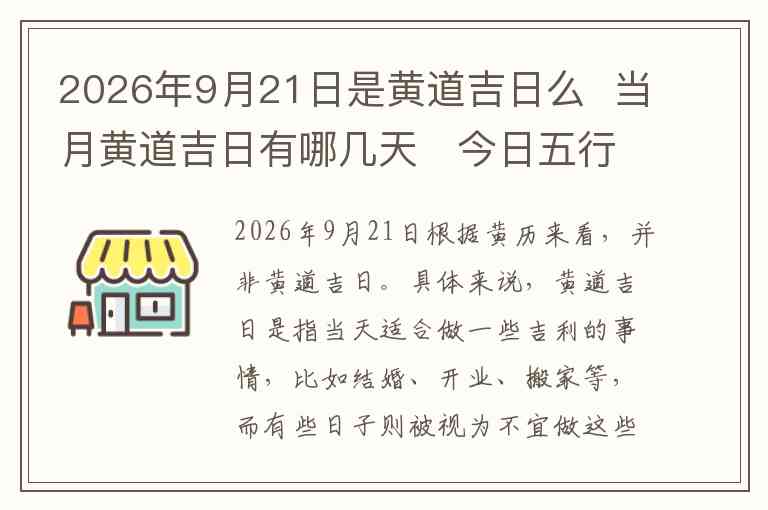 2026年9月21日根据黄历来看,并非黄道吉日。具体来说,黄道吉日是指当天适合做一些吉利的事情,比如结婚、开业、搬家等,而有些日子则被视为不宜做这些事情,往往会被标记为"煞日"或"冲日"。