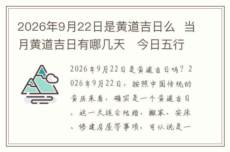 2026年9月22日,按照中国传统的黄历来看,确实是一个黄道吉日。这一天适合结婚、搬家、安床、修建房屋等事项,可以说是一个充满吉祥的日子,适宜进行大多数喜庆活动。根据传统黄历的指示,这一天的五行属土,适合做与土相关的活动,也有利于聚财和增旺。