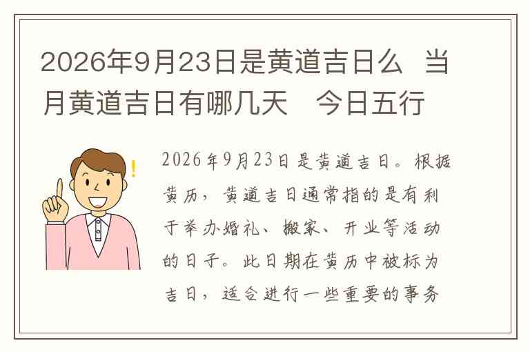 2026年9月23日是黄道吉日。根据黄历,黄道吉日通常指的是有利于举办婚礼、搬家、开业等活动的日子。此日期在黄历中被标为吉日,适合进行一些重要的事务。