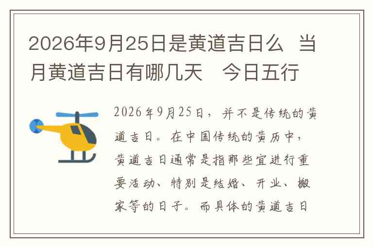 2026年9月25日,并不是传统的黄道吉日。在中国传统的黄历中,黄道吉日通常是指那些宜进行重要活动、特别是结婚、开业、搬家等的日子。而具体的黄道吉日是根据天干地支的组合、星宿等多方面因素来定的。