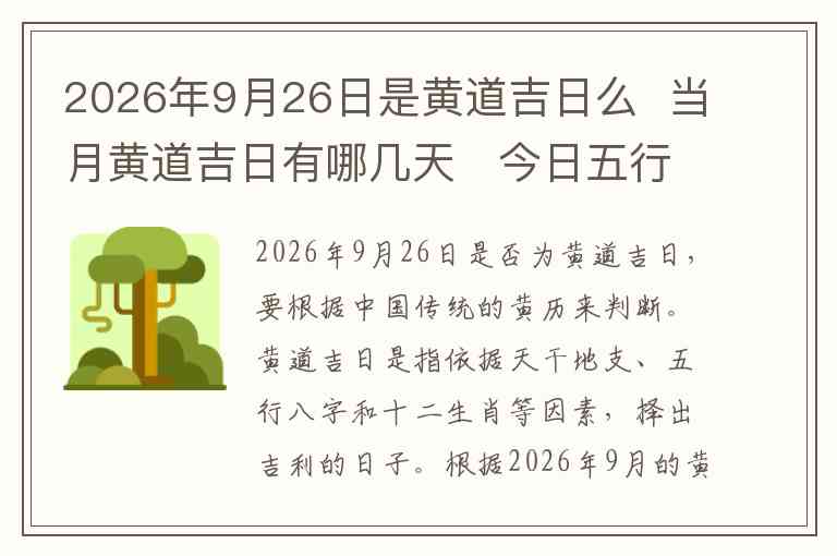 2026年9月26日是否为黄道吉日,要根据中国传统的黄历来判断。黄道吉日是指依据天干地支、五行八字和十二生肖等因素,择出吉利的日子。根据2026年9月的黄历,9月26日恰好是一个适合结婚、开业、搬家等活动的吉日。综合来看,9月26日是一个黄道吉日,适合开展重要活动。