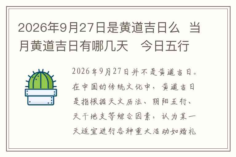 2026年9月27日并不是黄道吉日。在中国的传统文化中,黄道吉日是指根据天文历法、阴阳五行、天干地支等综合因素,认为某一天适宜进行各种重大活动如婚礼、开工、搬家等,属于“宜”日。而黄道凶日则是与这些活动相冲的日子,宜忌多种。