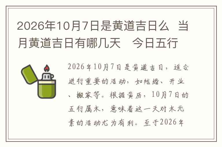 2026年10月7日是黄道吉日,适合进行重要的活动,如结婚、开业、搬家等。根据黄历,10月7日的五行属木,意味着这一天对木元素的活动尤为有利。