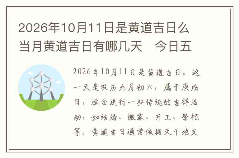 2026年10月11日是黄道吉日。这一天是农历九月初六,属于庚戌日,适合进行一些传统的吉祥活动,如结婚、搬家、开工、祭祀等。黄道吉日通常依据天干地支、五行等元素来决定,每个月都会有若干个黄道吉日,以帮助人们选择合适的时机做一些重要的决策。