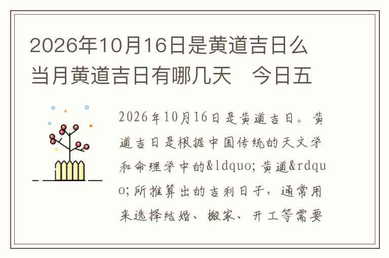2026年10月16日是黄道吉日。黄道吉日是根据中国传统的天文学和命理学中的“黄道”所推算出的吉利日子,通常用来选择结婚、搬家、开工等需要挑选合适日子的活动。每月的黄道吉日并不固定,而是根据天干地支和五行相生相克的规律来安排的。
