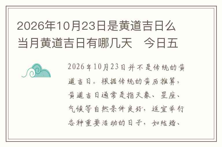 2026年10月23日并不是传统的黄道吉日。根据传统的黄历推算,黄道吉日通常是指天象、星座、气候等自然条件良好,适宜举行各种重要活动的日子,如结婚、开业、搬家等。