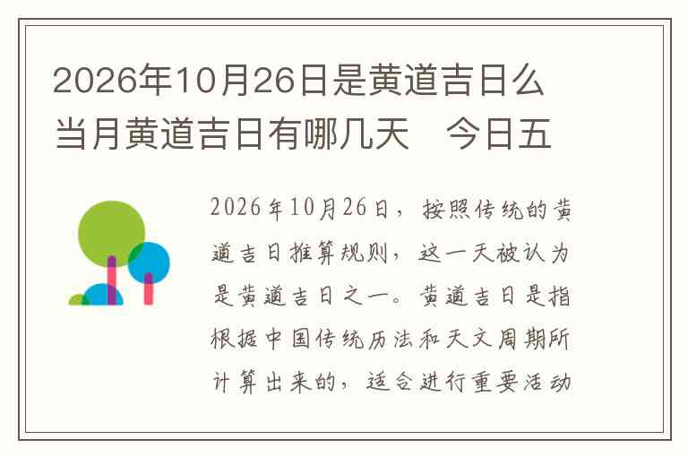 2026年10月26日,按照传统的黄道吉日推算规则,这一天被认为是黄道吉日之一。黄道吉日是指根据中国传统历法和天文周期所计算出来的,适合进行重要活动的日子。黄道吉日通常用来选择结婚、搬家、开业等吉祥的日子。每个月的黄道吉日都不一样,根据天象的变化及传统的推算方式而定。