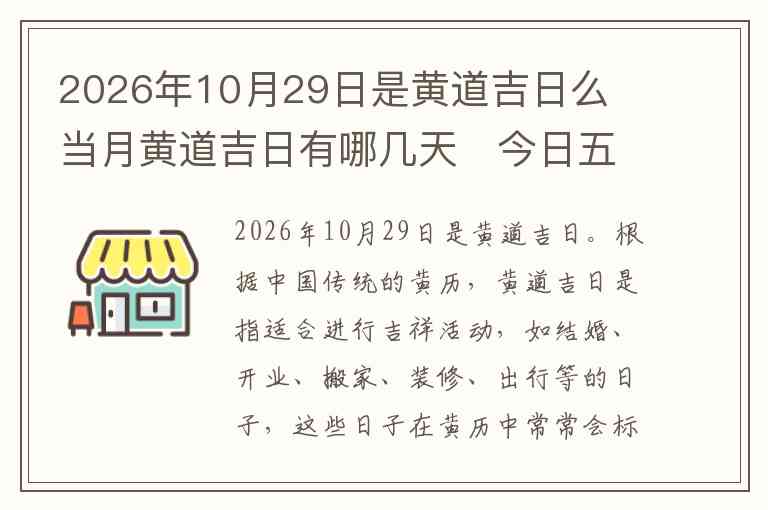 根据中国传统的黄历,黄道吉日是指适合进行吉祥活动,如结婚、开业、搬家、装修、出行等的日子,这些日子在黄历中常常会标注为“宜”的活动。2026年10月29日恰好是一个适合做许多事的好日子,所以被认为是黄道吉日。