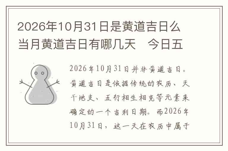2026年10月31日并非黄道吉日。黄道吉日是依据传统的农历、天干地支、五行相生相克等元素来确定的一个吉利日期。而2026年10月31日,这一天在农历中属于“辛丑”日,属于丑土,五行属于土,通常不被认为是黄道吉日。