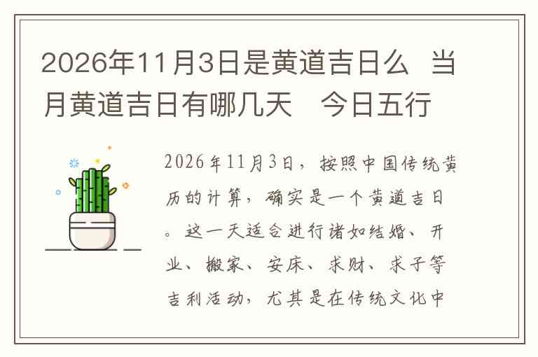 2026年11月3日,按照中国传统黄历的计算,确实是一个黄道吉日。这一天适合进行诸如结婚、开业、搬家、安床、求财、求子等吉利活动,尤其是在传统文化中,这一天被认为是适合大多数喜庆和重要事务的日子。