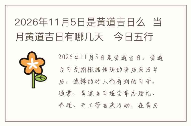 2026年11月5日是黄道吉日。黄道吉日是指根据传统的黄历或万年历,选择的对人们有利的日子。通常,黄道吉日适合举办婚礼、乔迁、开工等吉庆活动。在黄历中,这些日子被认为天地吉气较为集中的时刻,能为人们带来好运。