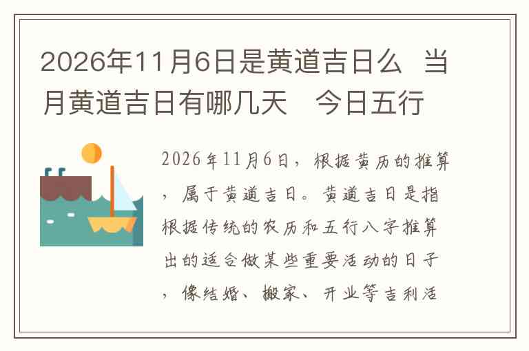 2026年11月6日,根据黄历的推算,属于黄道吉日。黄道吉日是指根据传统的农历和五行八字推算出的适合做某些重要活动的日子,像结婚、搬家、开业等吉利活动都会选择黄道吉日。11月6日当天,适合进行婚庆、搬家、开工、开业等事情。